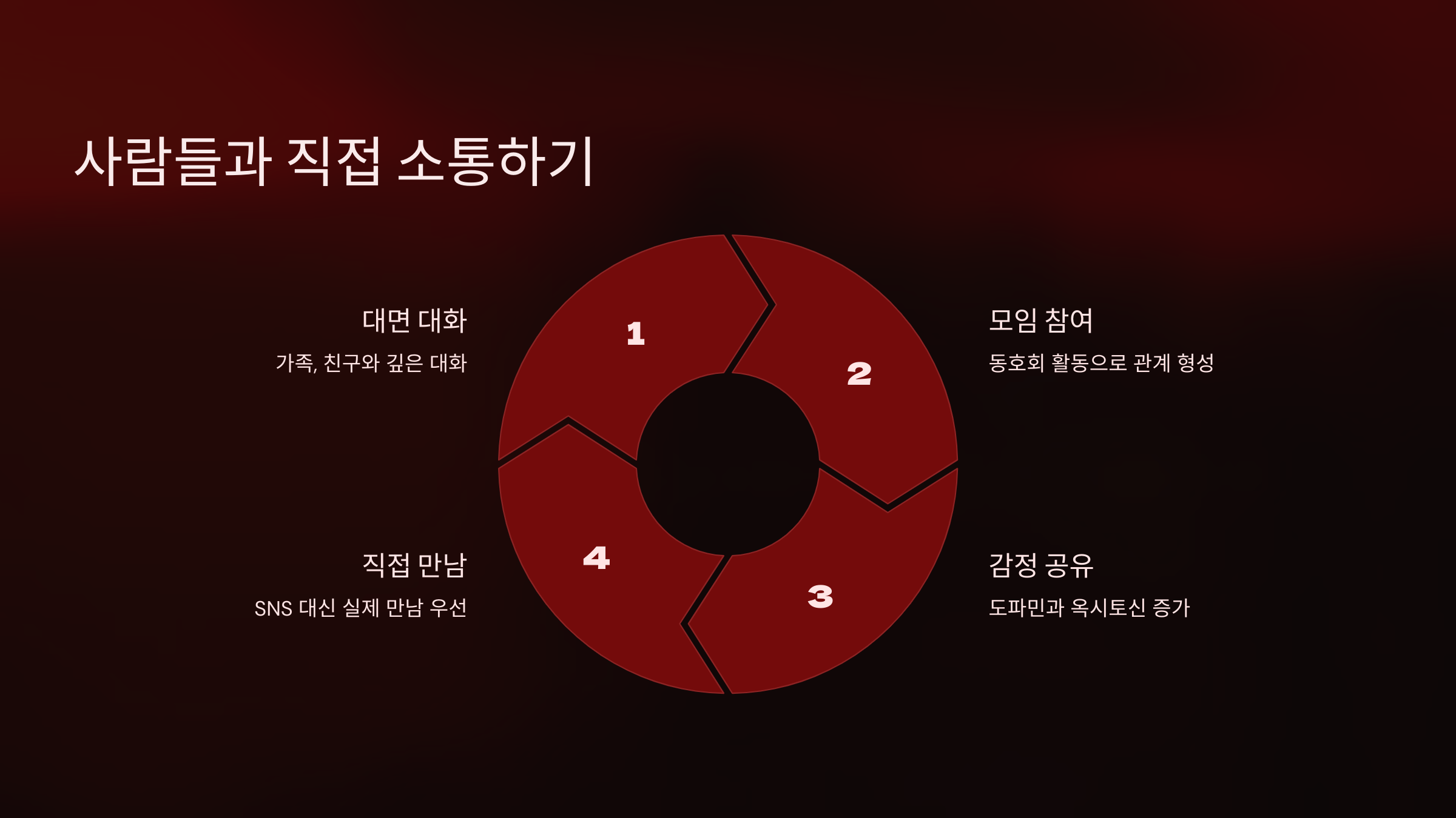 실제 대화를 나누고 감정을 공유하는 과정에서 도파민과 옥시토신이 자연스럽게 증가합니다.