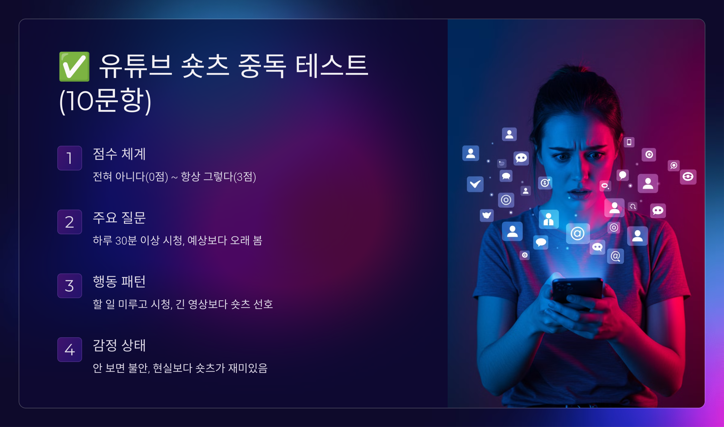 유튜브 숏츠, 적당히 보면 유용하지만 중독되면 집중력 저하와 현실 감각 둔화를 초래할 수 있어요. 여러분의 점수는 몇 점이었나요? 댓글로 공유해 주세요! 😊